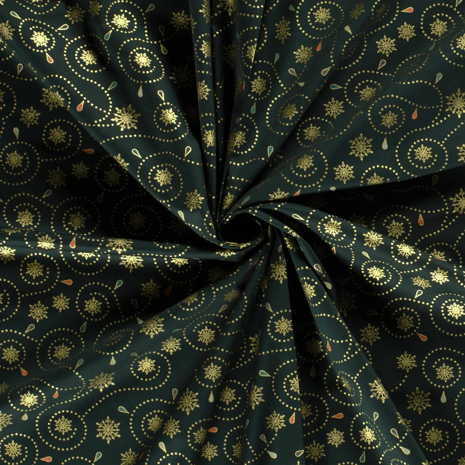 Jólaefni, grænt bómullarefni með áprentuðu gylltu jólaskrauti.